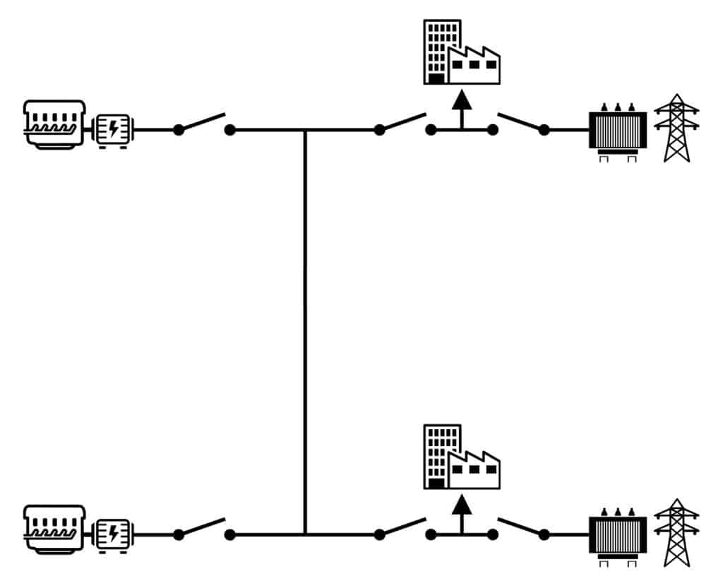 DécouvrirPlusieurs générateurs avec possibilité de couplage au réseau, typologie 2 disjoncteurs réseau