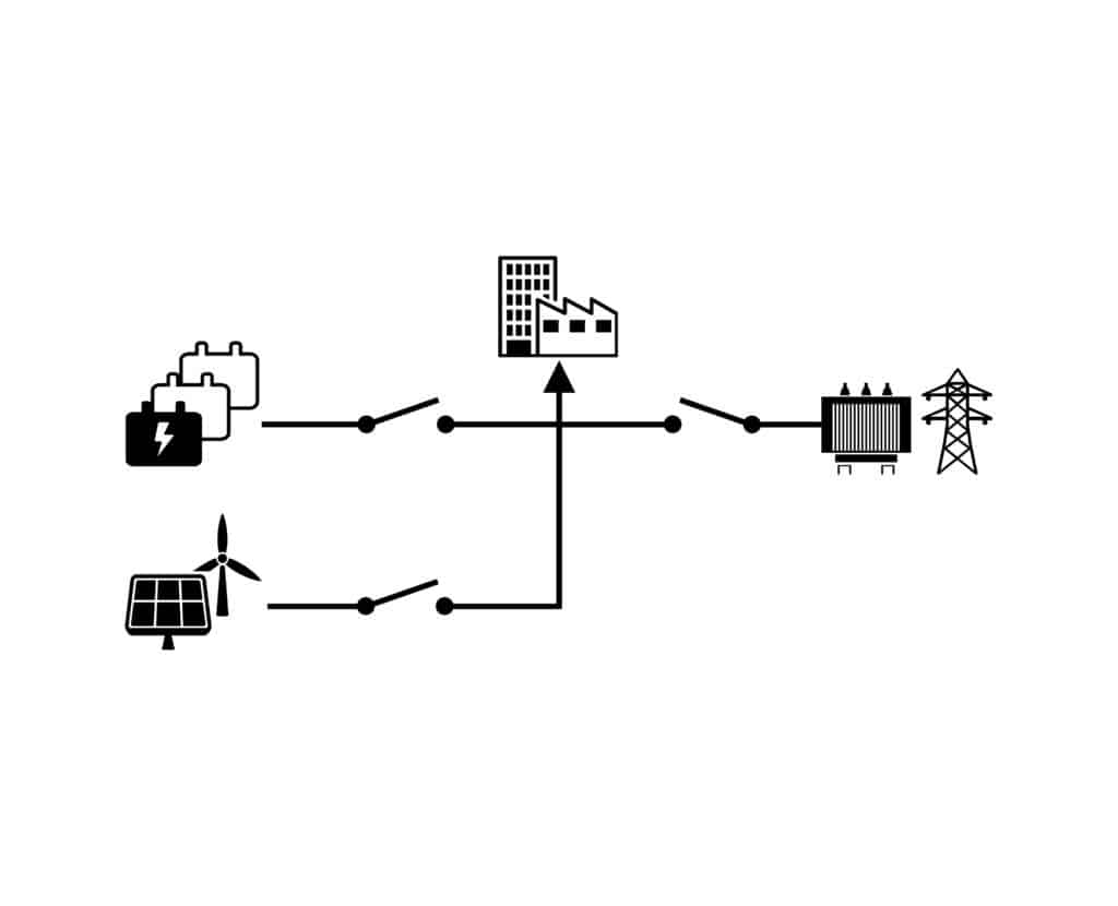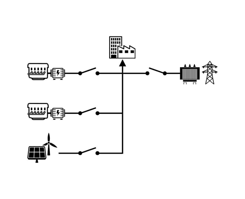 DécouvrirPlusieurs générateurs avec possibilité de couplage au réseau, typologie un disjoncteur réseau
