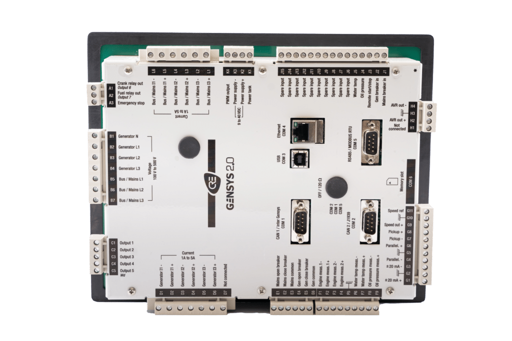 Le GENSYS 2.0 est un contrôleur « tout-en-un » complet et compact incluant la gestion moteur, la synchronisation, la puissance active et réactive, le contrôle jusqu’à 32 générateurs ou d’un seul générateur en parallèle avec le réseau (saut de vecteur + ROCOF + Power Management, protection moteur et électriques, PLC embarqué, CAN J1939 gestion communication, protection homopolaire…). Module pour le contrôle du générateur avec les technologies de communication suivantes: Ethernet, lecteur carte SD, site web embarqué, TCP Modbus, CANopen, …