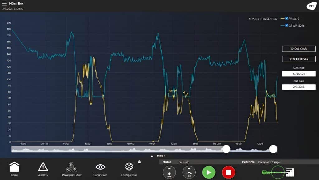 Grâce à l’option de superposition des courbes, il est clairement visible que les onduleurs photovoltaïques (courbe jaune) génèrent plus de puissance que le groupe électrogène (courbe bleue) pendant les heures ensoleillées.
