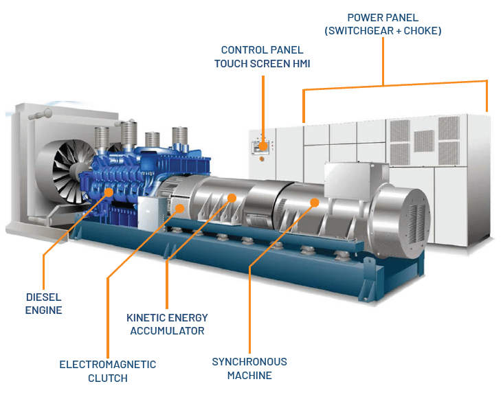 Le GENSYS 2.0 utilise toute ses capacités en termes d’automatisme interne afin de gérer la séquence complexe de lancement et de couplage du générateur ; contrairement aux générateurs traditionnels, le temps 0 est démarré une première fois selon une séquence très longue pour lancer le volant d’inertie, une fois le volant à vitesse nominale le moteur est débrayé et c’est un moteur électrique qui prendra le relais de maintien en vitesse de la roue, à ce moment l’excitation est désactivé sur l’alternateur et l’installation prête en cas de manque secteur. Lorsque le manque secteur est détecté, le rôle du GENSYS 2.0 est d’exciter l’alternateur dans un délai très court et de basculer la charge sur l’alternateur afin de permettre le secours électrique du site pendant que le moteur est lancé et embrayé.
