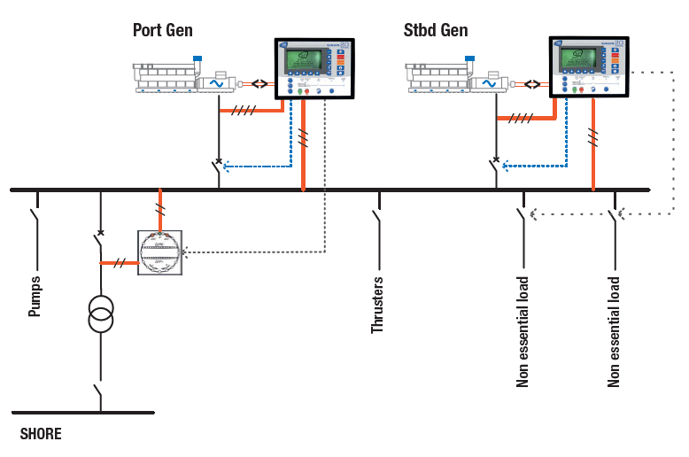 Le GENSYS 2.0 MARINE permet le délestage des charges non essentielles à la sécurité du bord sur détection de surcharges ou de sous-fréquences.