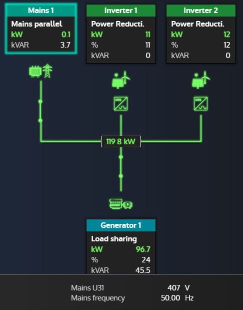 - Une vue unifilaire de la centrale regroupant les paramètres importants des différentes sources.