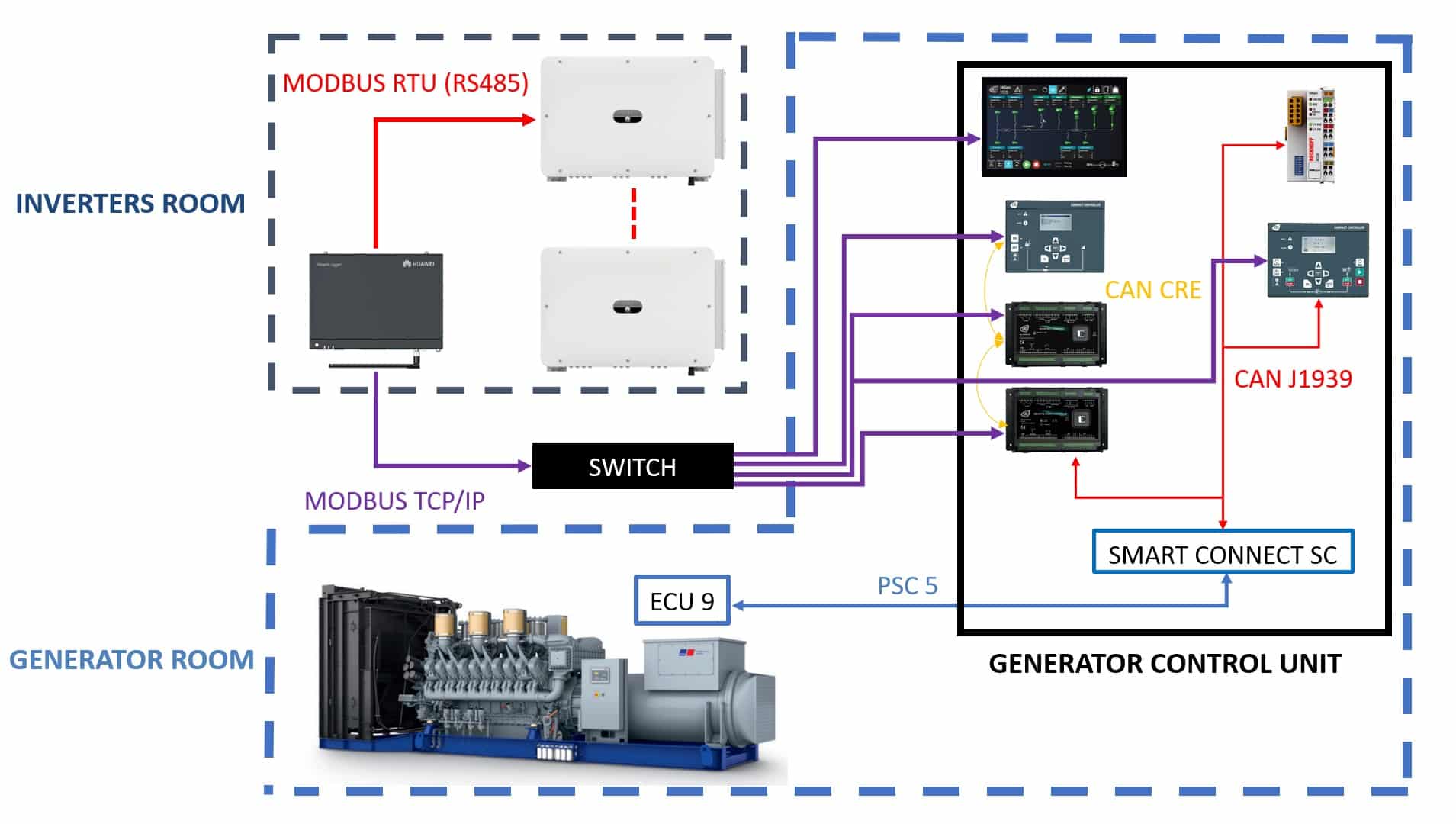 - Synchronisation intelligente et une répartition proactive des charges (puissance active et réactive) entre le générateur et les onduleurs photovoltaïques.