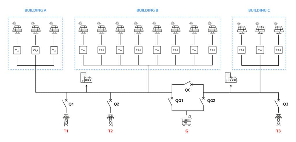 - Alimentation continue et sécurisée : Garantir une continuité d’alimentation pour des infrastructures critiques, même en cas de coupure réseau, grâce à une gestion combinée des sources photovoltaïques et du générateur.