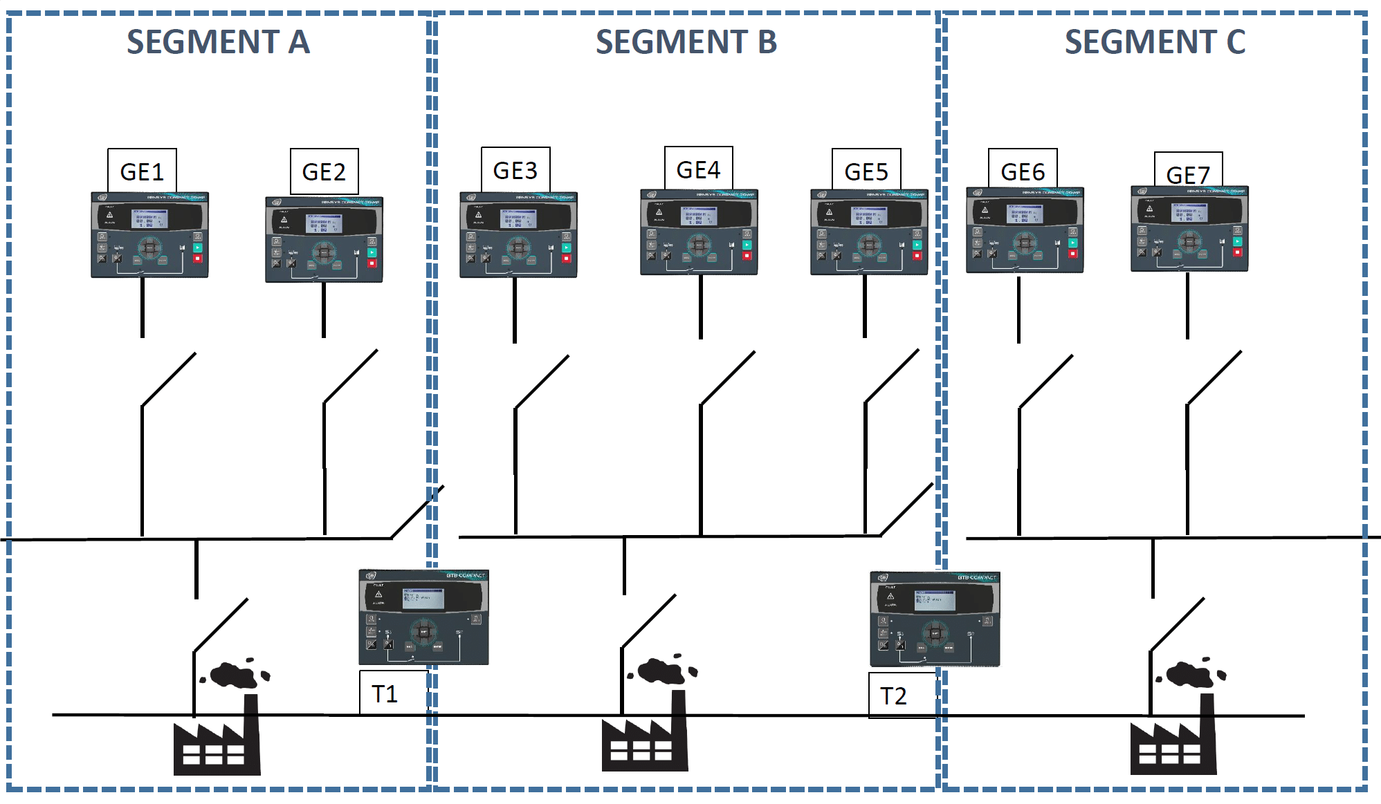 Les GENSYS COMPACT PRIME sont réglés pour assurer la gestion automatique du démarrage/arrêt en fonction de la charge qui prendra en compte la position ouverte/fermée de chaque segment (ex : si le disjoncteur de traverse 1 est ouvert, et le disjoncteur de traverse 2 est fermé, nous obtiendrons alors une centrale en gestion automatique des cinq GE 3 à 7 du segment B & C qui arrêtons et démarrerons en fonction de la charge, idem pour les générateurs 1 et 2 sur le segment A).